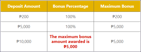 SPINS members who make their first deposit will receive a 100% cash bonus. The minimum deposit amount is ₱200, with no maximum deposit limit. The maximum bonus amount awarded is ₱5000.